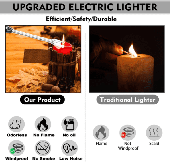 • Portable AND HUMANIZED HOOK DESIGN: The Electric Lighter adds a convenient hook design to make it easy to find when needed.Our Candle Lighters Are Light and Easy To Carry. It Is Ideal for Camping, Barbecue, Hiking, BBQs, candles, cooking, fireplaces, fireworks, Indoor and Outdoor Activities.