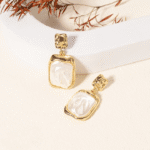 Designed for the modern trendsetter, each earring features a rectangular silhouette with a beautifully sculpted, pearl-like center that catches the light from every angle. The organic texture of the white stone adds a touch of natural elegance, while the sleek metallic frame—available in both silver and golden finishes—brings a refined, contemporary edge.