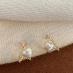Elegant Gold-Plated Heart Pearl Earrings – Minimalist Design with Zircon Accents – Cross Heart Peal Korean Earrings (PJT-993)