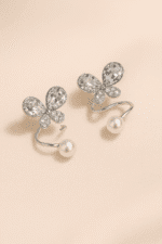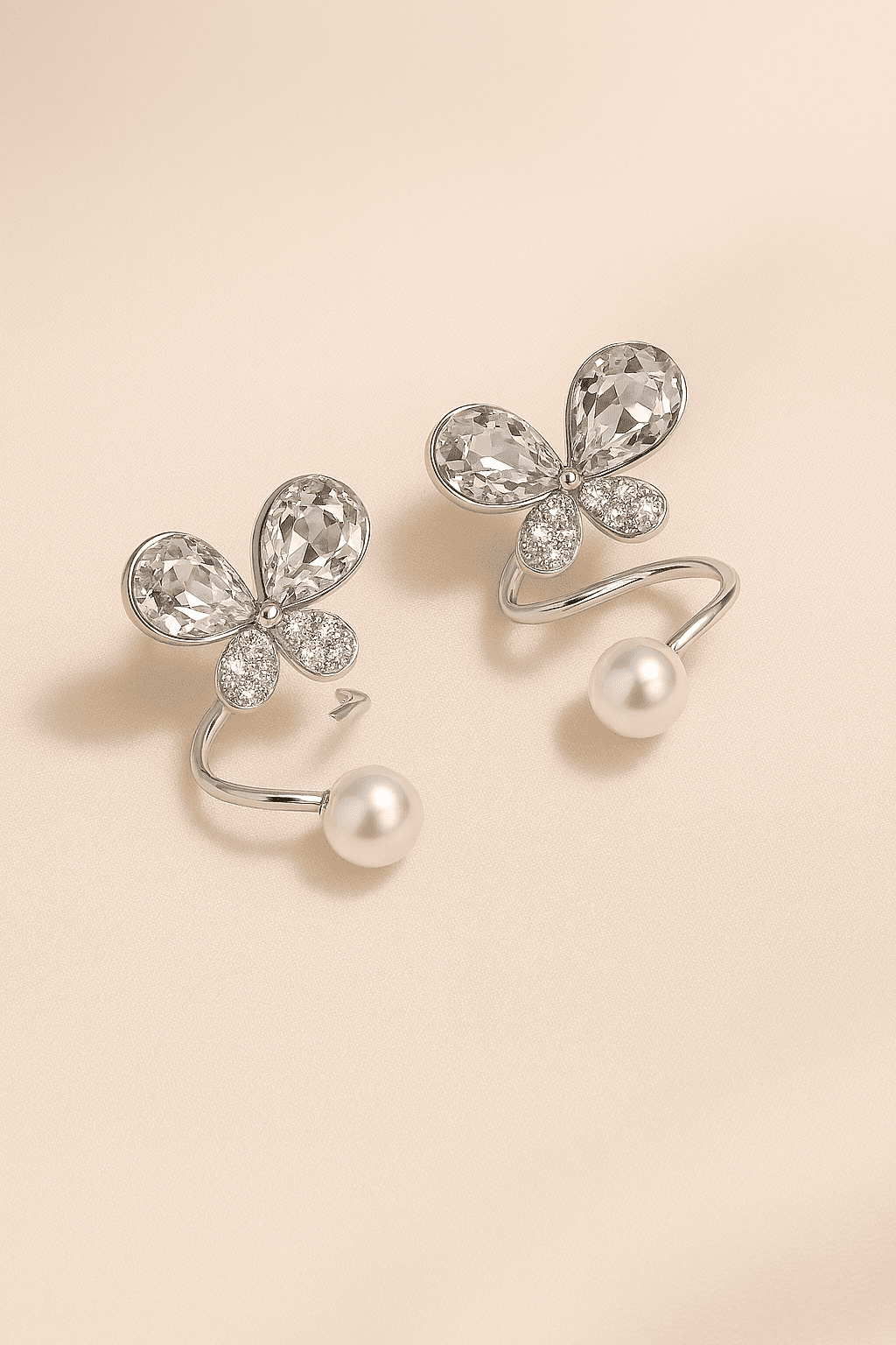 Add a touch of elegance and charm to your look with our Tangled Korean Pearl Earrings. These stylish earrings feature a unique twisted band design accented with delicate faux pearls and shimmering butterfly motifs made of crystal-clear stones and pave-set rhinestones. The perfect blend of modern Korean fashion and classic grace, ideal for both everyday wear and special occasions.
